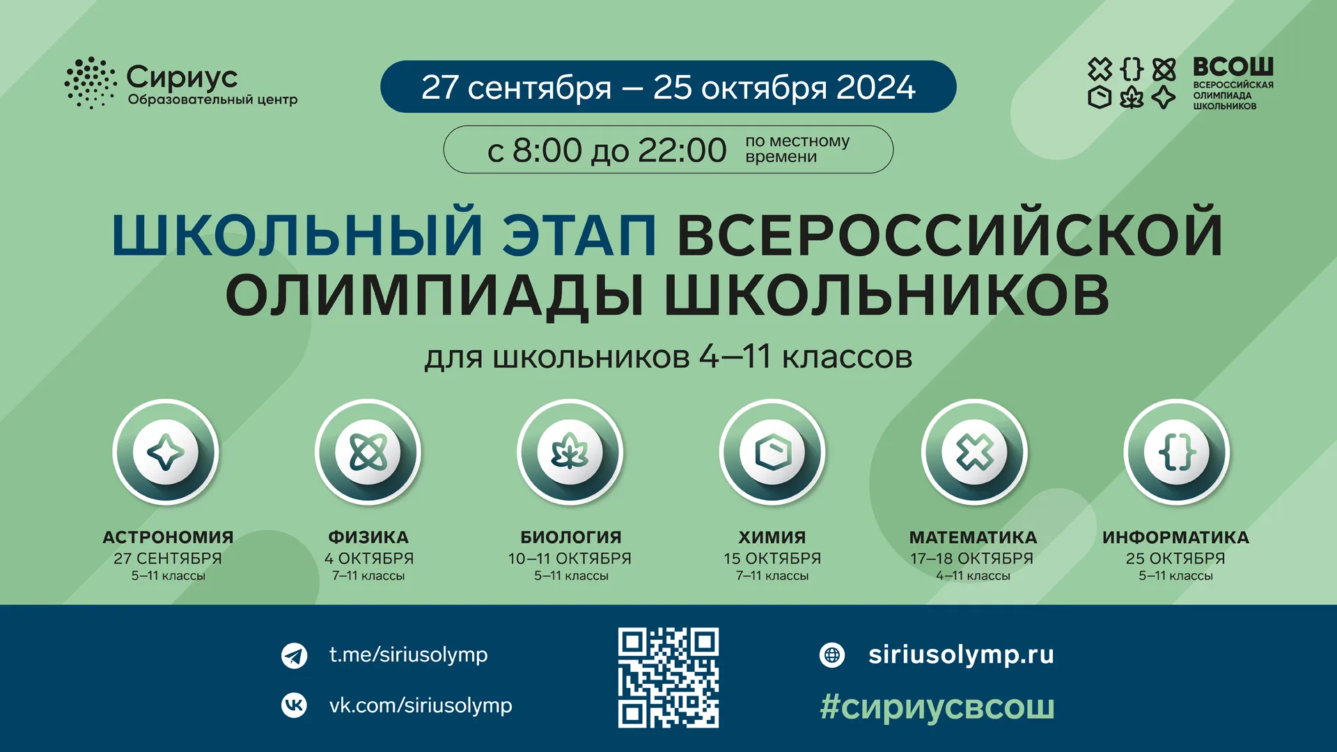 В МБОУ - ООШ №12 п.Малая Горка в 2025/2026 учебном году школьный этап всероссийской олимпиады школьников (далее - Олимпиада) будет проводиться с 18.09 по 23.10. 2025 года по всем образовательным предметам , в том числе с использование информационно-коммуникационных технологий на платформе «Сириус.Курсы» Образовательного Фонда «Талант и ycпex» (далее – платформа) по астрономии, биологии, информатике, математике, физике, химии).